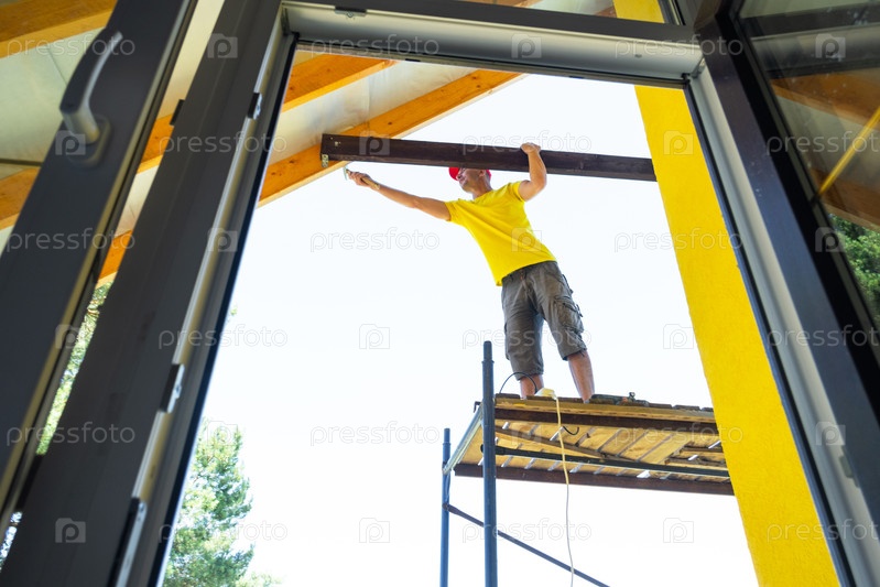 Человек на лесоматериале работает под деревянной балки, угол строительства с близкого расстояния, дизайн фасада, современная архитектура, профессиональное улучшение жилища