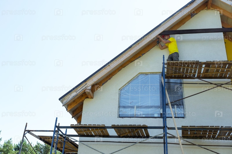 Строительный работник под солнечным светом на боковом лесоматериале, устанавливая большой деревянный элемент под габлом, ремонт дома снаружи, безопасность видна