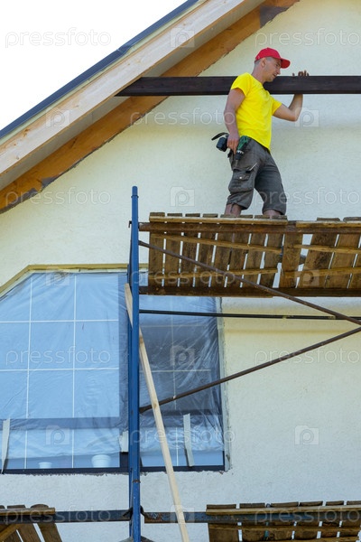 Работник на наружном лесоматериале фиксирует вертикальную доску к фасаду, желто-белый дом, видимые инструменты и ручные детали, усилия по реконструкции