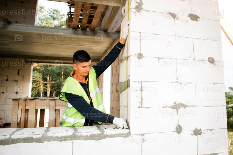 Строитель проверяет вертикальный уровень, выравнивание стен, измерение площадки, планирование строительства, профессиональную инспекцию, ремонт дома, командную работу, контроль прогресса