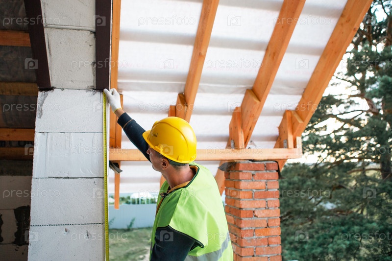 Плотник в шлеме отмечает линию для будущей рафы на бетонной стене, начальный этап установки задержки для новой системы крыши дома