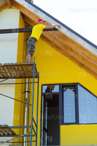 Строитель в желтом поднимается на узкие леса, готовится к деревянной установке на высоком фронтоне, сосредотачивается на ручном процессе и безопасности, модернизации современного жилого дома