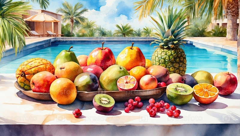 Иллюстрация акварелью: тропическая плодовая тарелка с бассейном на заднем плане, праздничный завтрак, меню "все включено", реклама путешествий и туризма, декор блога, красочное кулинарное искусство