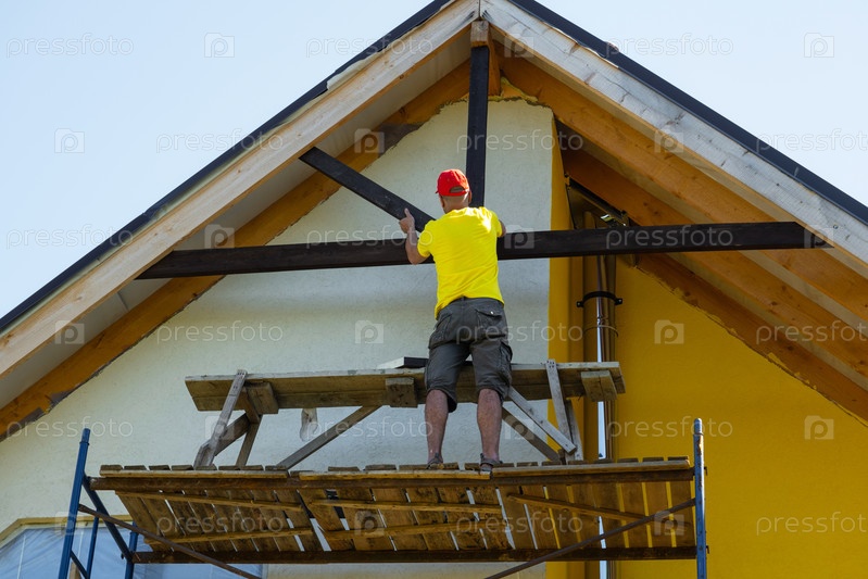 Строительный работник стоит на лесовке, измеряет деревянную отделку под крышей, желтый дом, шлем безопасности, проект по улучшению дома, специалист по открытому воздуху на работе