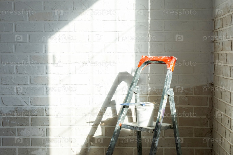 Ремонт стены интерьера, подготовка краски, лестница, поставки краски, рабочее пространство для улучшения помещений и домашнего декора, отделка конструкции