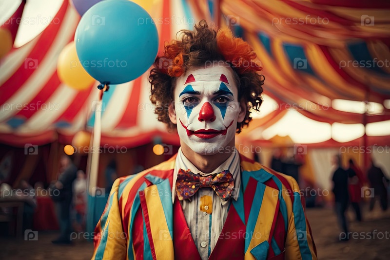 Цирковый клоун с воздушным шаром ? красочная сцена события, исполнитель для вечеринки, реклама, билет, семейное развлечение, детское мероприятие, празднование фестиваля