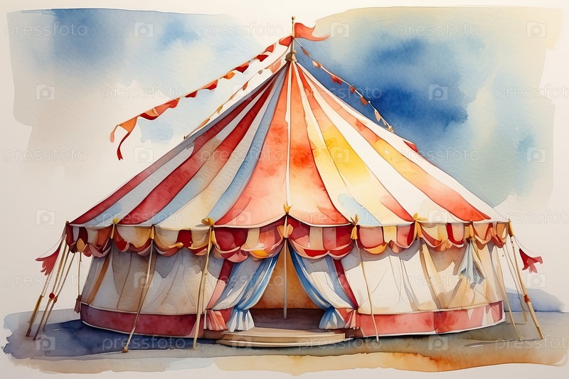 Акварельный цирковый купольный шатер ? праздничный полосатый большой верх, идеально подходит для плакатов на мероприятия, билетов, приглашений на вечеринки, детских шоу, игривого семейного торжества, вызывает радость и удивление