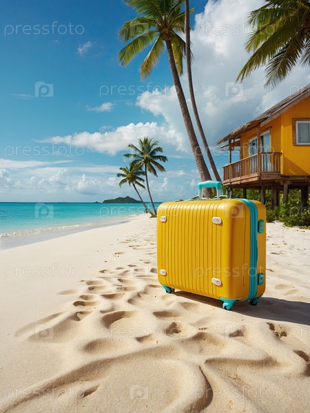 Одинокий желтый чемодан, стоящий на солнечном белом пляже, пальма, чистое голубое море, привлекательные продажи туристических пакетов, летние предложения, реклама агентства, текстовая зона баннера