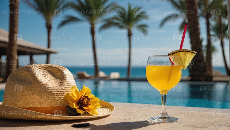 Шляпа и тропический напиток у бассейна отеля, отдых для досуга, туристический пакет, безопасность летом, релаксация у бассейна, комфорт и безопасность