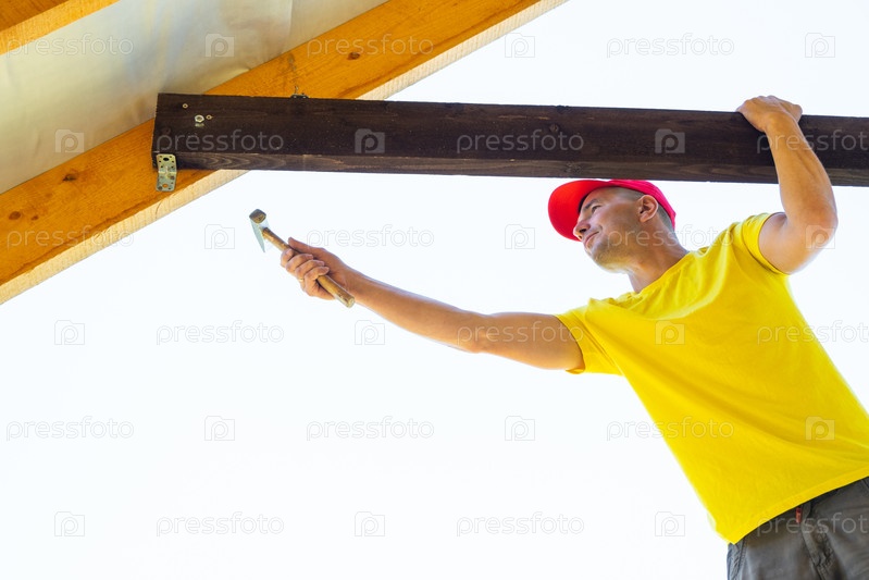 Мужчина-ремесленник протягивает руку под кромку крыши, обеспечивая отделку отверткой, внешний вид ремонта дома, желтую стену и современные деревянные элементы