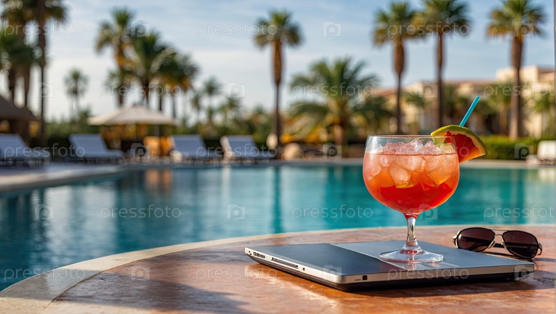 Тропический бассейн с коктейлем, шляпой и ноутбуком, удаленная работа, расслабляющее рабочее пространство, отпускная работа, место для текстовых сообщений