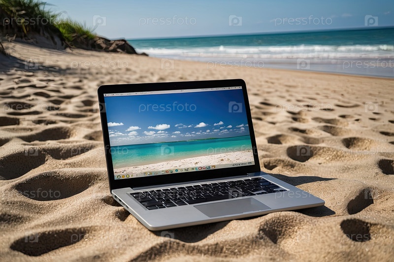 Ноутбук на песке у океана, удаленная работа в отпуске, Wi-Fi рабочее место, пустой дисплей для рекламы или сообщений