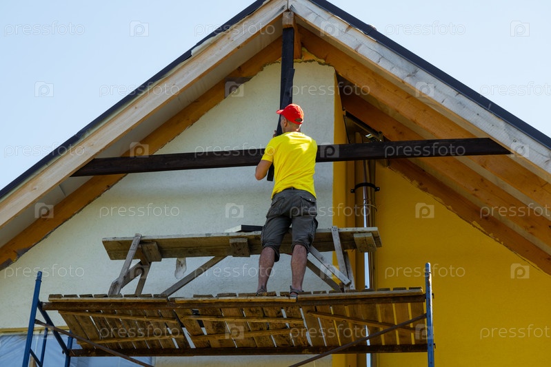 Человек в желтой рубашке, закрепляющий деревянную декоративную балки на фасаде дома с помощью силовой дрели, современный внешний вид дома, мастерство ремесленника, работа над лесовкой, сцена повышенного ремонта