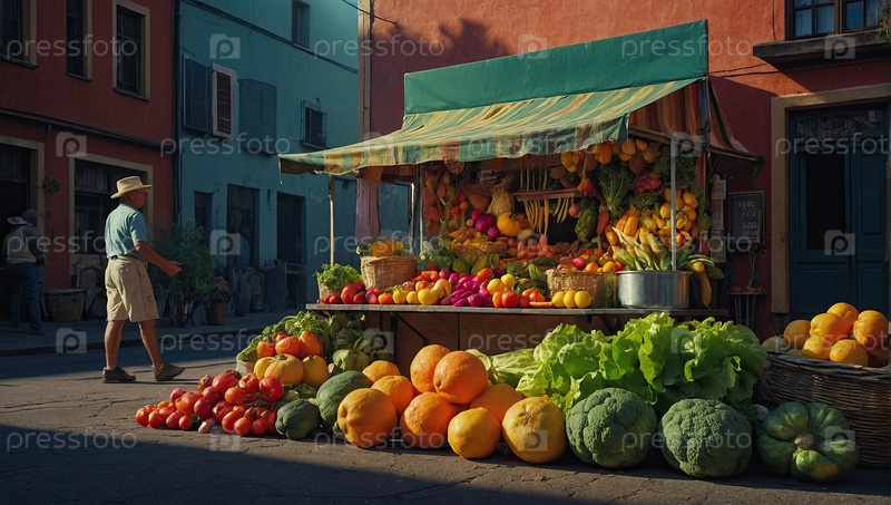 Фермеры покупают экологичные овощи и корзины с фруктами ? местный рынок, открытый киоск, здоровые свежие продукты, семейное мероприятие в деревне, сельский уличный рынок, ярмарка, ассортимент