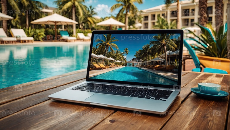Ноутбук в тропическом бассейне, рай для удаленной работы, образ жизни цифрового кочевника, высокоскоростной доступ к Интернету, место назначения фрилансеров