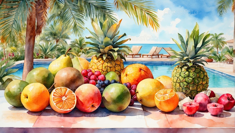 Ручно нарисованный акварельный завтрак с ананасом, манго, ягодами в морском отеле, экзотическая еда, отдых на курорте, здоровый баннер, туристическое меню "все включено", декоративное искусство