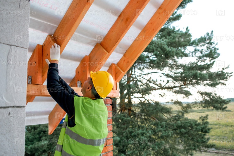 Строительный работник выстраивает деревянные балки крыши для нового дома, стропила устанавливаются шаг за шагом, предохранительный жилет и шлем, опыт столярства