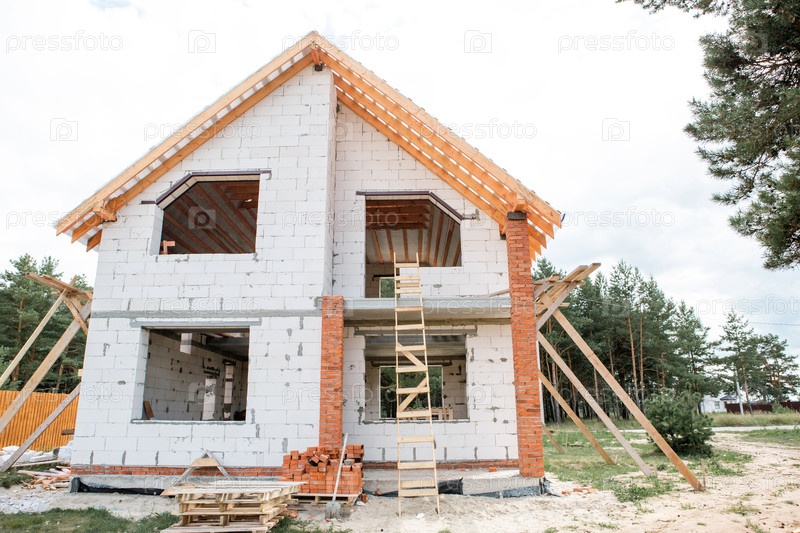 Современный дом с открытой системой плотин, установка задержки на крыше в процессе, светлый фасад, европейский архитектурный стиль, активное строительство