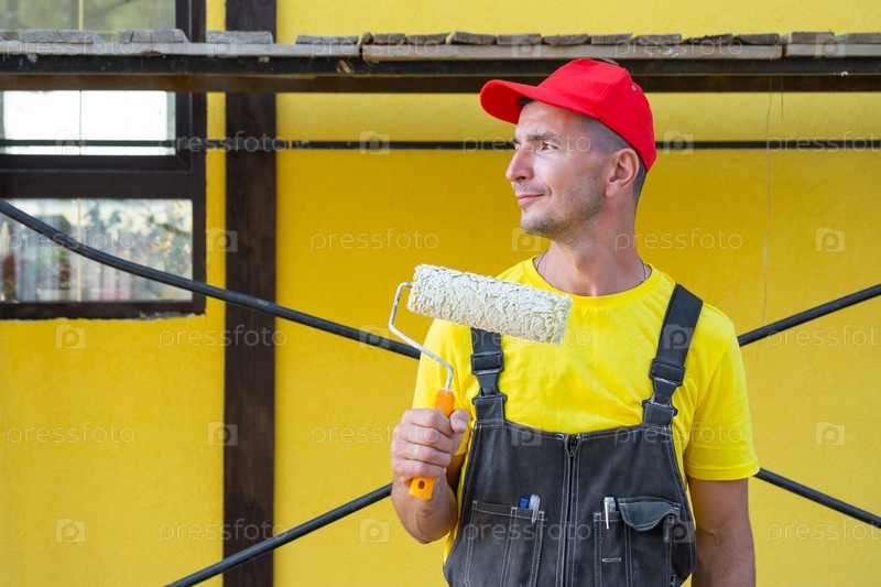 Портрет ремесленника, желтая рубашка, трофель в руке, штукатурки, ремонт самодельного строительства, частный бизнес, комплект инструментов для ремонта дома, консультационная экспертиза
