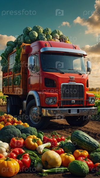 Красный яркий фермерский грузовик с овощами ? местная осенняя распродажа, сельское празднование, эко-ярмарка, урожайное мероприятие, продовольственный рынок, семейные каникулы, фестивальная атмосфера
