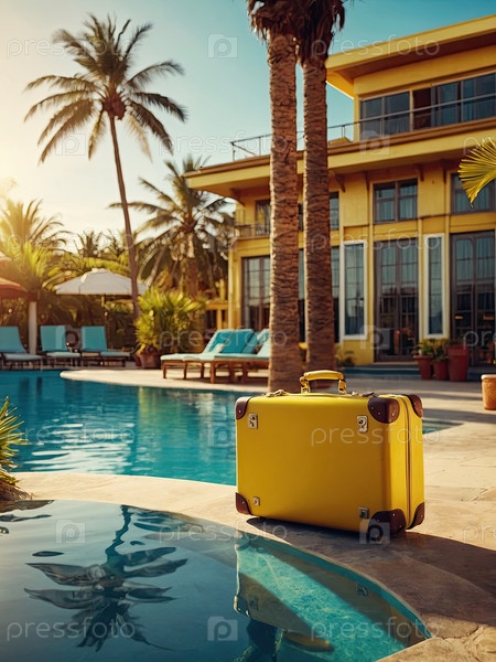Шикарный чемодан у бассейна в роскошном отеле-курорте, прибытие туристов, баннер агентства, реклама тура, продвижение бронирования, идеи путешествий, четкая текстовая область для сообщения