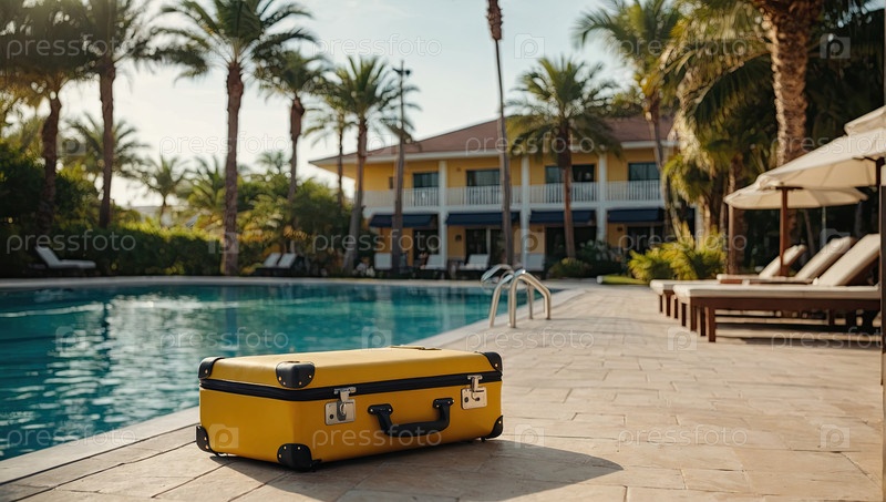 Желтый чемодан на террасе бассейна от роскошной виллы, пальмовый фон, промо для эксклюзивного отдыха, продажа тура, бронирование агентства, прибытие в пункт назначения, возможно текстовое пространство