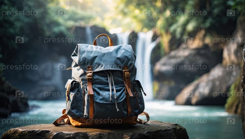 Пара туристических рюкзаков у водопада, активные приключения на открытом воздухе, путешествия, треккинг, туризм, спорт и темы рюкзака, здоровый дикий образ жизни, концепция командной работы