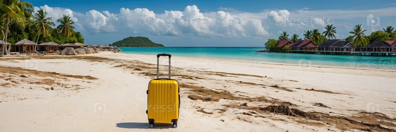 Туристический чемодан на тропическом песчаном берегу, пальмы и вода в отдалении, летние каникулы, баннер продаж для турагентства, акция со скидкой, место для текста объявления