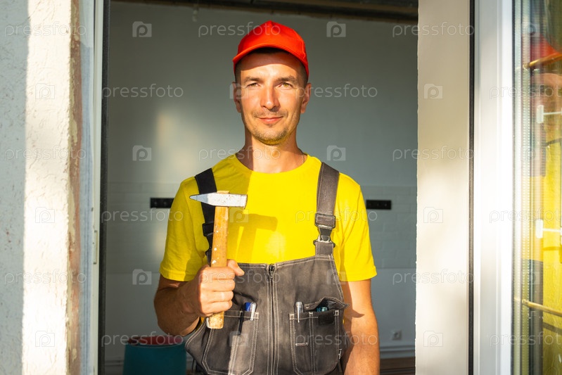 Портрет строительного работника в красной шапке, держащего молот, готовый к плотничеству, гвоздям и ремонту дома, бизнесу уборщика, набору инструментов на месте