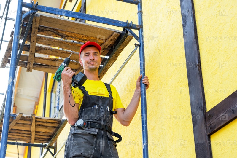 Мастер фасадов с отвертками на лесомашинах, монтаж и фиксация наружных деталей, установка элементов, частное строительное предприятие, профессиональный строитель