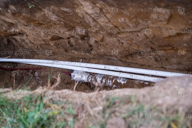 Ямка с прокладкой водопроводных труб, изолированная коммунальная труба, фундамент трубы, земляные работы, монтаж сантехники, наружное питание, защита от наземного тепла
