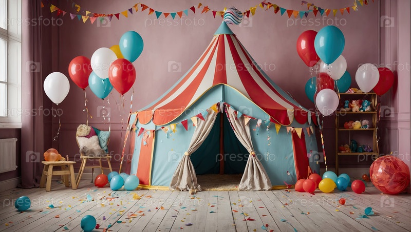 Декор детской комнаты в цирковом стиле ? палатки, воздушные шары, яркие цвета, идеально подходят для дня рождения, тематика вечеринки, веселый игривый интерьер, празднование детей, праздничное настроение