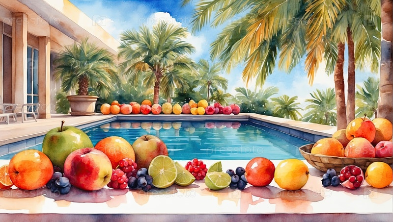 Водяной рисунок: гостиничный бассейн и фрукты на столе, завтрак "все включено", меню путешествий и туризма, летние каникулы, рекламный блог, баннер, иллюстрация для декора здоровой еды