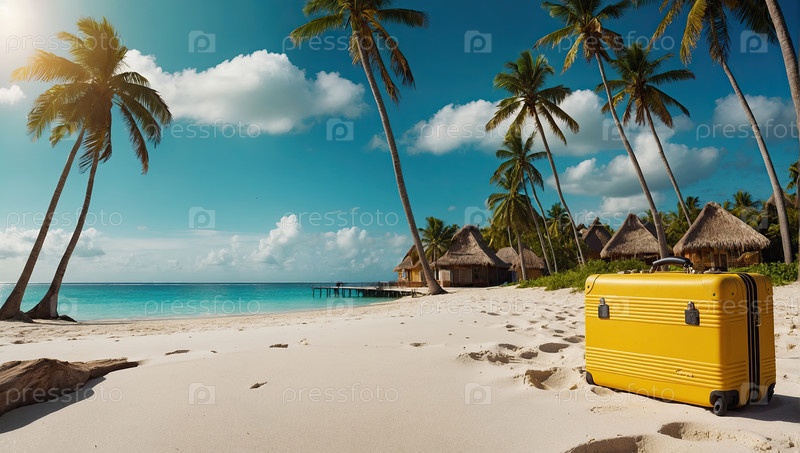 Тропический океан с чемоданом на белом песке, пальмовый остров, прибытие туристов в курорт, свежая реклама путешествий, объявление агентства о скидках, использование в баннерах, открытая зона копирования
