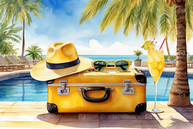 Иллюстрация акварелью: желтый чемодан с соломенной шляпой и солнцезащитными очками у бассейна, прибытие в тропический курорт, туризм, промо бронирования, баннер для бизнеса туристического агентства