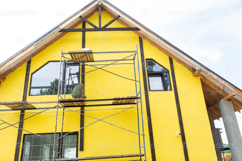 Окрашенный фасад с декоративными деревянными досками, образующими полудеревянный вид, наружное покрытие стен, готовый слой штукатурки, цвет, реконструкция, заключительный шаг строительства