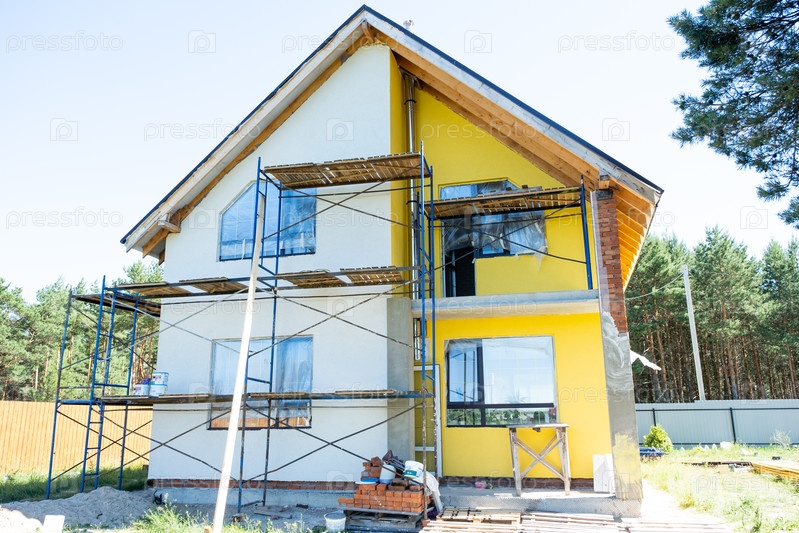 Экстериор дома окрашен в гипс, остатки скелетов, отделка изображений, детальные деревянные доски для полудеревянного фасада, ремонт и строительство завершены