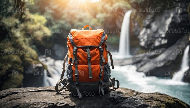Оранжевый рюкзак для походов на берегу реки, дикий водопад, приключенческий треккинг, спортивные путешествия, фитнес на открытом воздухе, туристическая экспедиция, оздоровительное путешествие, промо современного горного снаряжения