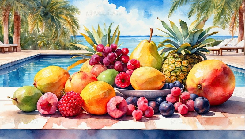 Водяные рисунки: разнообразие свежих фруктов на курорте Палм-Бич, кухня "все включено", промо путешествий и туризма, меню здоровой еды, иллюстрация блога, рекламный или декоративный плакат