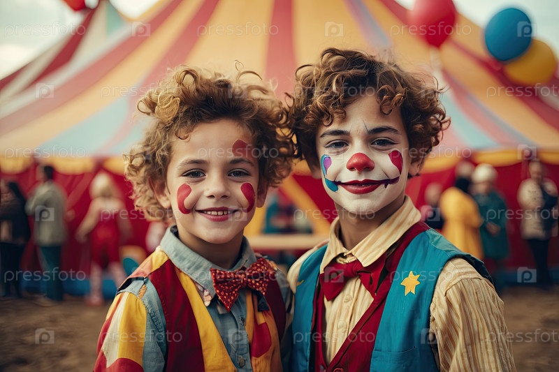 Детские друзья-клоуны, цирковые костюмы, улыбающийся ? иллюстрация плаката для детского дня рождения, флаер, приглашение на вечеринку, мероприятия, фестиваль, вызывает радость, дружбу, смех