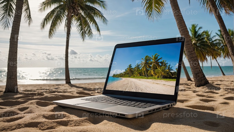 Ноутбук под пальмами на пляже, онлайн удаленная работа, Wi-Fi соединение, свободная вакансия, копирайтинг на экране