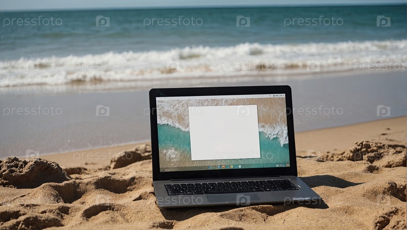 Ноутбук на солнечном пляже с пустым экраном, удаленный бизнес-доступ в Интернет, фрилансная работа, место для рекламы текста