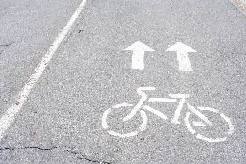 Знак велосипедной дороги и стрелки, нарисованные на городской дороге, безопасный маршрут для велосипедистов, градостроительная дорожная разметка, соблюдение правил движения
