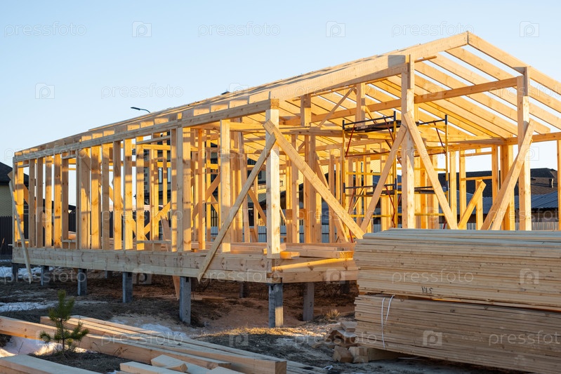Деревянные столбы и балки собраны для каркасного дома, деревянного скелета, монтажной основы, прогресса строительства, элементов поддержки участка, внешней установки фундамента