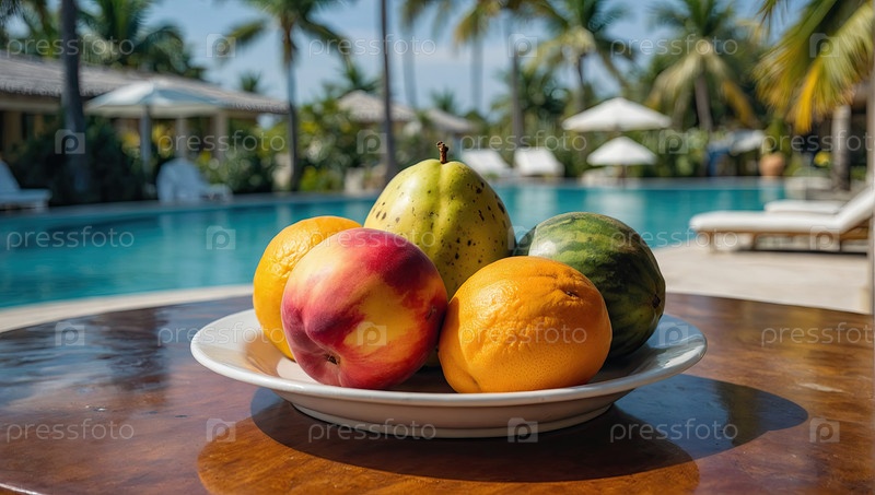 Стол с манго и апельсином у бассейна, современное питание в отеле, меню со всем включенным, здоровый курорт, семейный буфет для путешествий, баннер блога о гостеприимстве