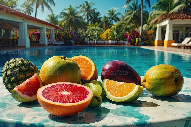 Вырезанная папайя, манго, арбуз на бассейновом столе, здоровый завтрак в тропическом отеле, еда для гостей со всем включенным, туристическое меню, цифровое объявление, блог о здоровье