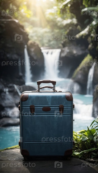 Стоящий чемодан перед спокойным водопадом в окружении тропического леса, путешествие на поиски, реклама путешествий, продвижение направления