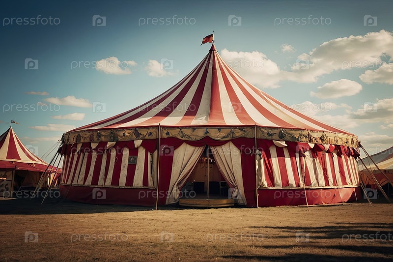 Цирковый купол на поле ? полосатая палатка, мероприятие на открытом воздухе, символ фестиваля, иллюстрация для брендинга, флаер, детское приглашение, праздничный плакат, причудливая радость