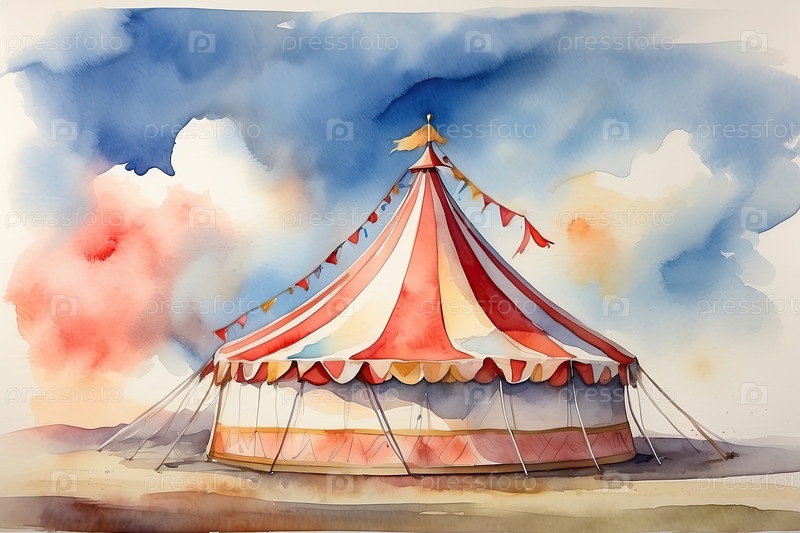 Акварельная цирковая палатка на открытом воздухе ? яркий купол, атмосфера фестиваля на улице для плакатов, приглашения к вечеринкам, мероприятия для детей, вызывает счастье, ожидание, магическое веселье