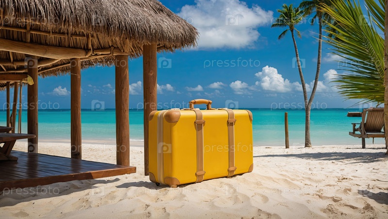 Семейные бунгало в тропическом курорте на море, два желтых чемодана на песке, предложение группового путешествия, туристическая реклама, летняя промо-акция агентства, бронирование отпуска, возможна текстовая зона